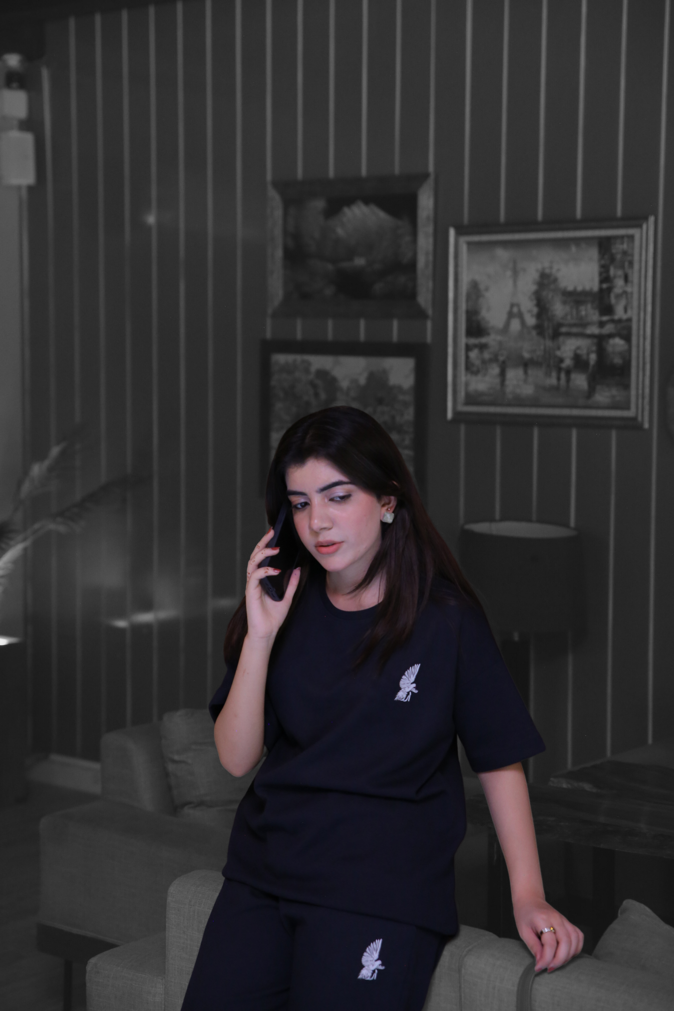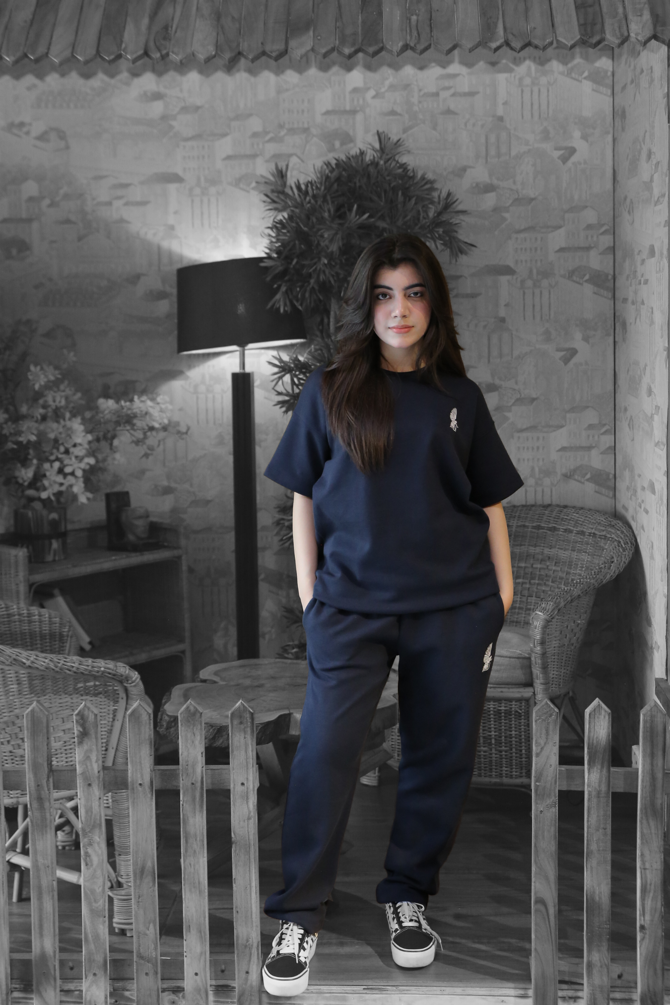 Design Detail: Minimalistic flying dove and Arzo logo subtly integrated on both the t-shirt and trousers.